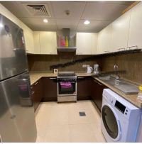 For rent, a furnished apartment in Amwaj with two bedrooms, two bathrooms, a kitchen, and a living room for 300 dinars inclusive.