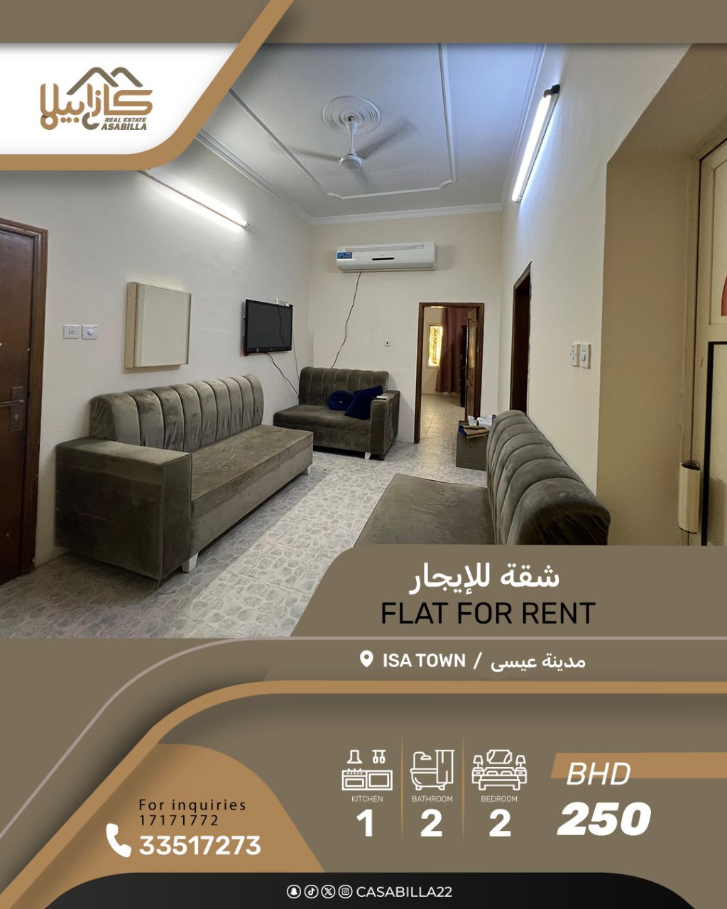 For rent: An apartment in Isa Town, close to the Modern Institute, suitable for family living. Fully furnished with a washing machine, refrigerator, and air conditioning in a quiet neighborhood, near vital services (mosque, supermarket, schools, commercial complexes, park, etc.). The apartment consists of 2 bedrooms, one master, 2 bathrooms, a living room, and a kitchen, with a parking space. Rent is 250 dinars, including electricity and water. For contact.