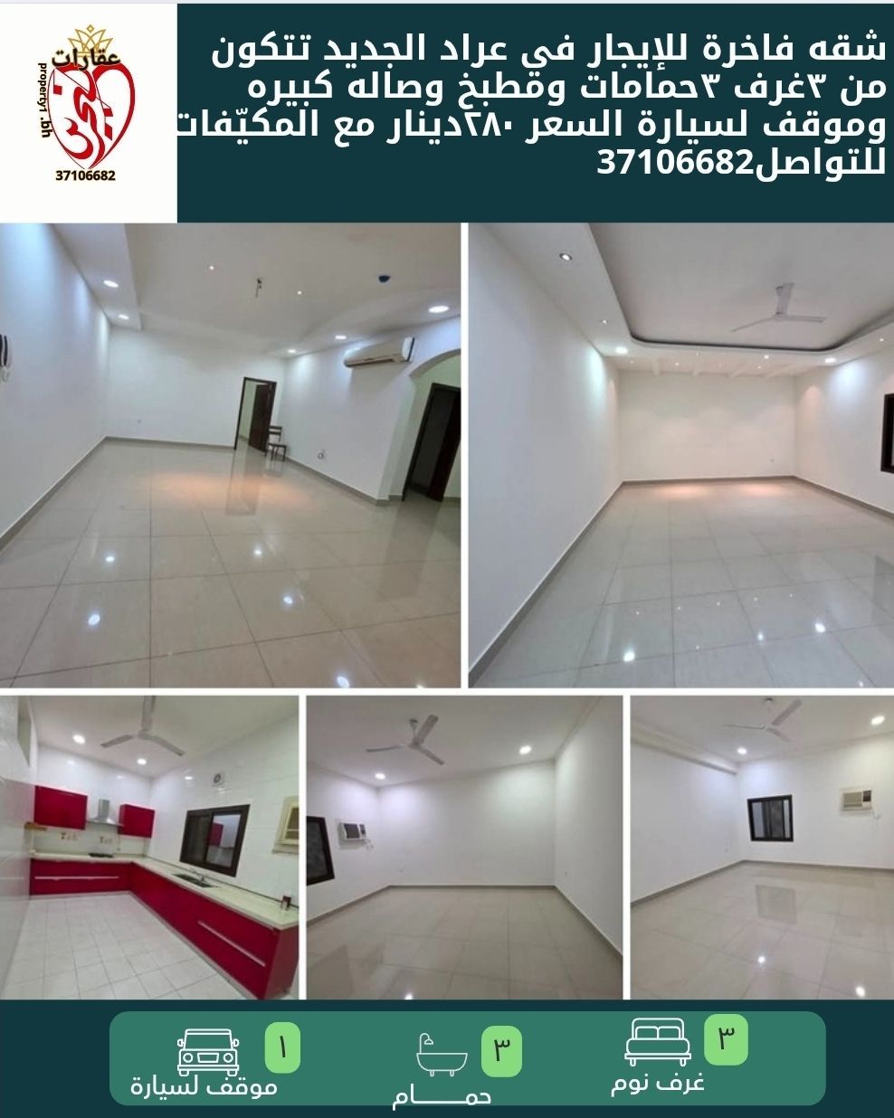 A luxurious apartment for rent in New Arad, consisting of 3 bedrooms, 3 bathrooms, a kitchen, a large living room, and a parking space. The price is 280 dinars with air conditioning included. For contact.