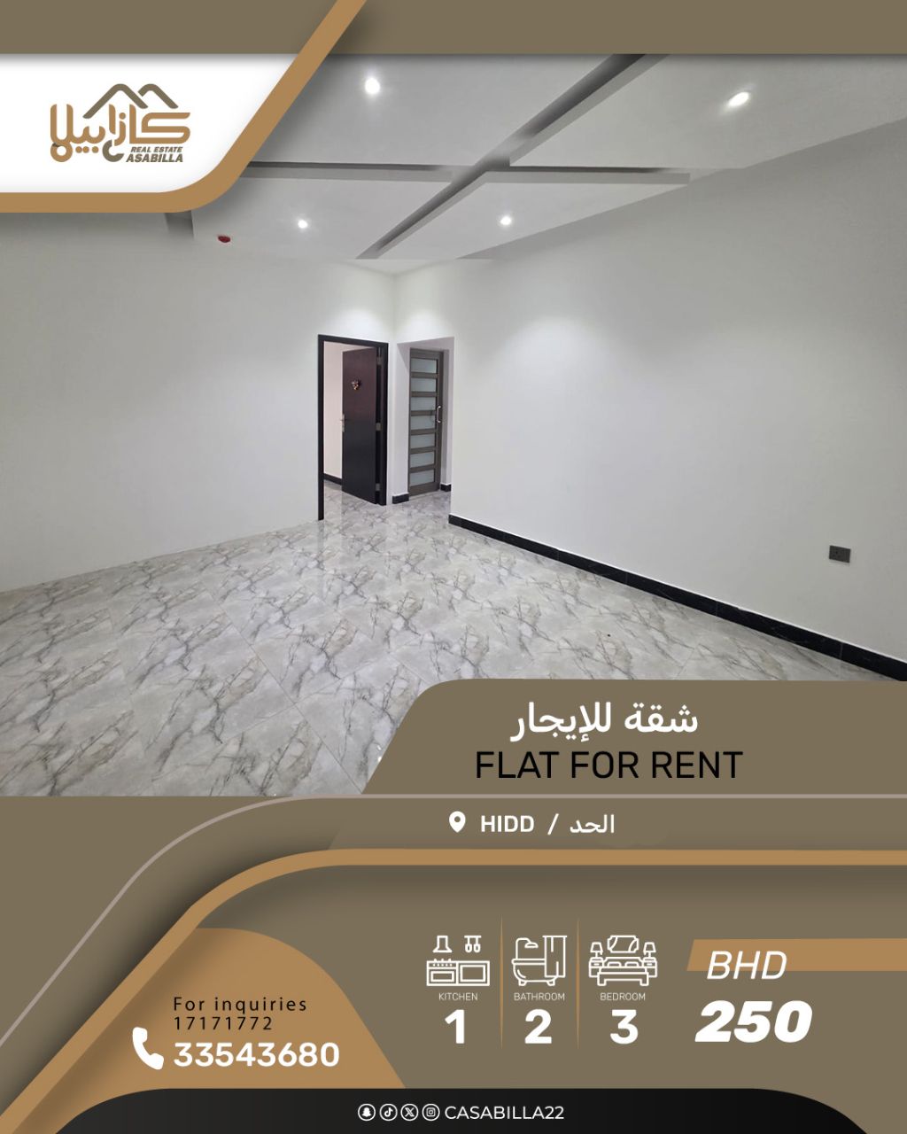 For rent: A 3-bedroom apartment in the Al-Hadd area with air conditioners. First, apartment details: 3 bedrooms (master bedroom), 2 bathrooms, spacious living room, kitchen with balcony. Second, facilities and services: elevator, car parking, close to all commercial shops. Rental price: 250 without electricity. For contact.