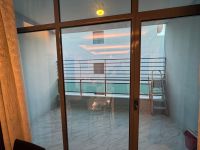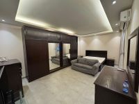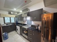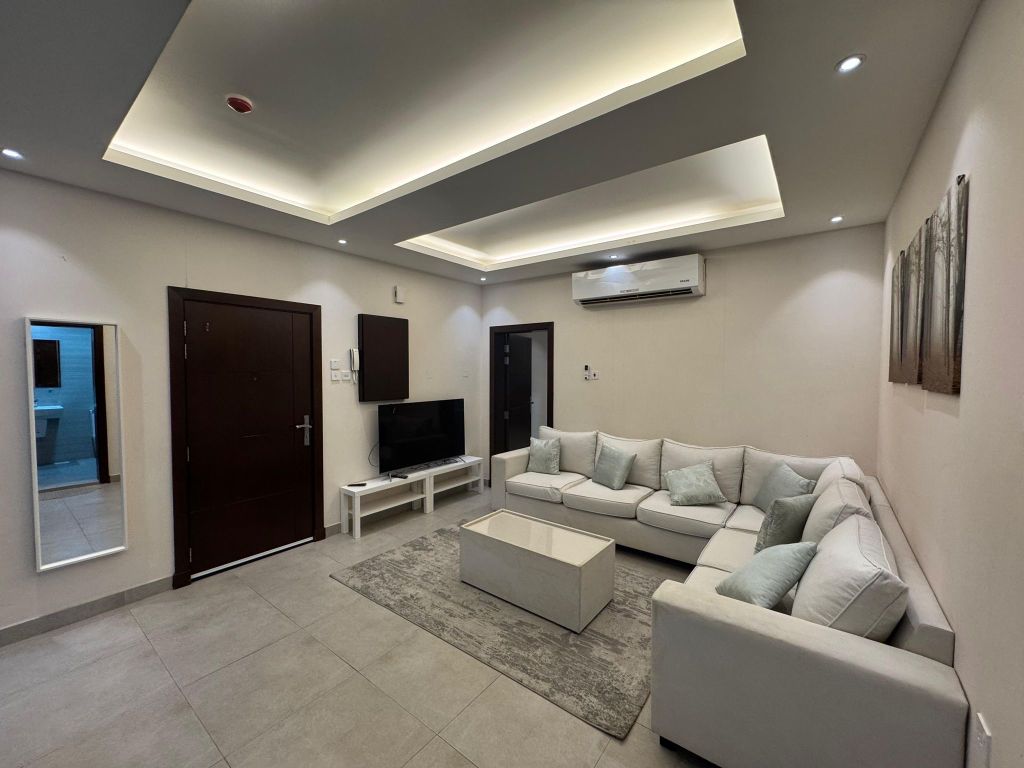 Furnished apartment for rent in Hidd with two bedrooms, two bathrooms, a living room, and a kitchen. It includes parking, periodic maintenance for the apartment and building, an elevator, and a guard. The price is BD280, including electricity