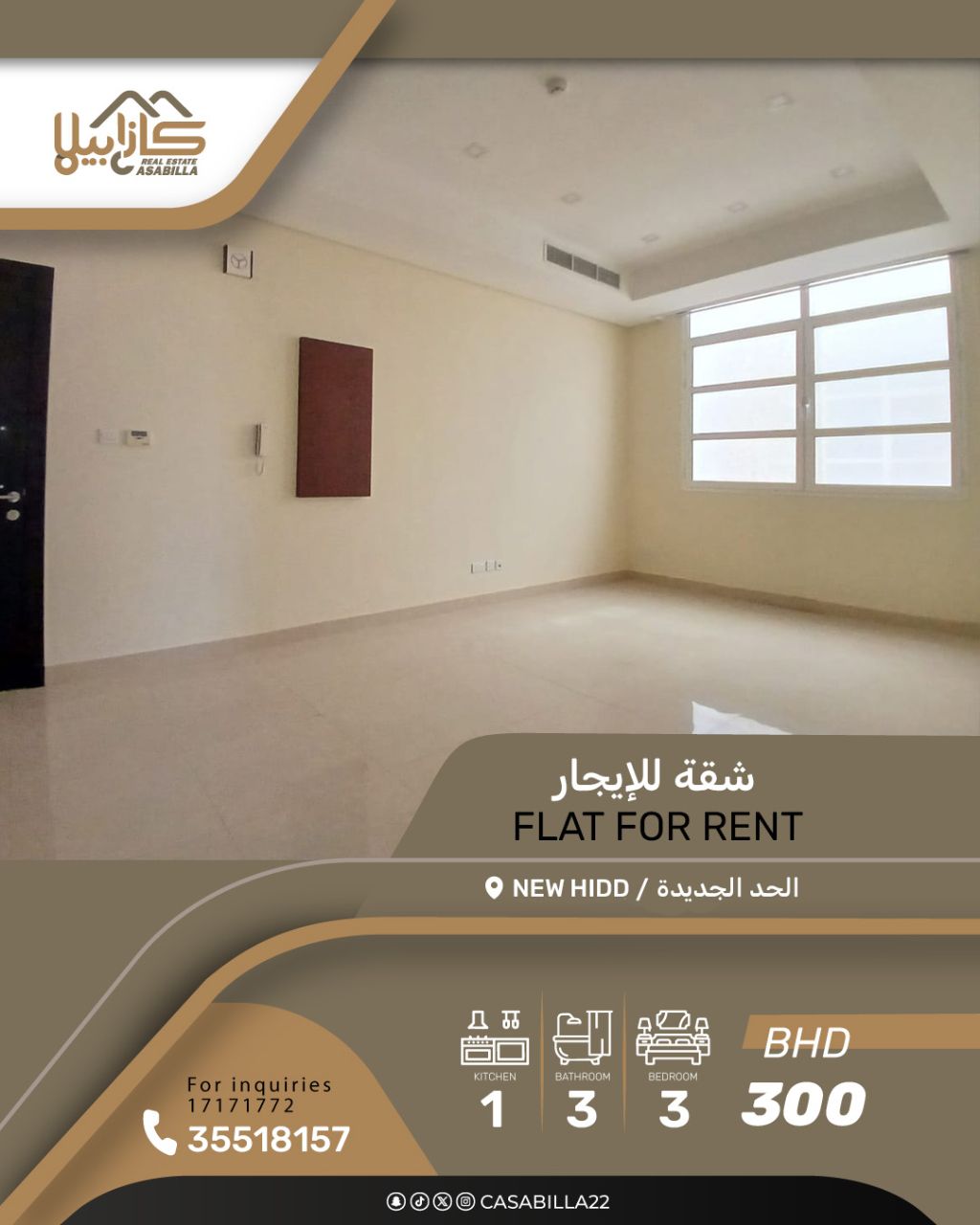 For rent: A luxurious semi-furnished apartment in the New Hidd area, suitable for residential and office use. It consists of 3 bedrooms, a spacious family living room, a kitchen, 3 bathrooms, central air conditioning, and a fully equipped kitchen. The price is 300 dinars, excluding electricity. For inquiries.