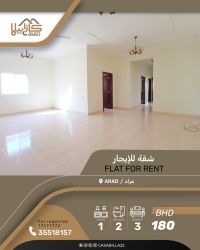 For rent: a spacious apartment in the Arad area, consisting of 3 bedrooms, a large family living room, a kitchen, and two bathrooms. Includes a private parking space. Price is 180 dinars, excluding electricity. For inquiries.