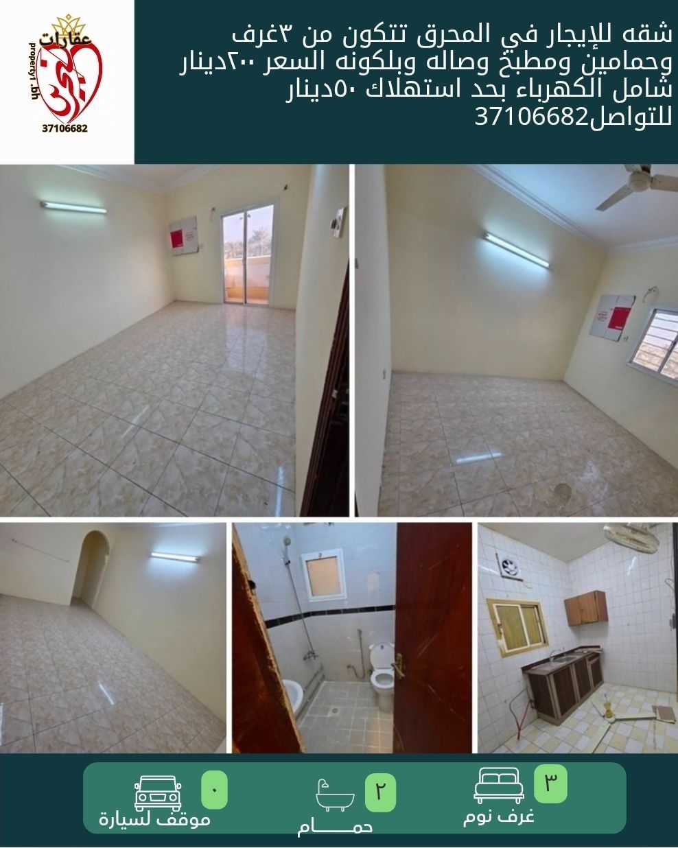 An apartment for rent in Muharraq consisting of 3 rooms, two bathrooms, a kitchen, a living room, and a balcony. The price is 200 dinars, including electricity with a consumption limit of 50 dinars. For contact.