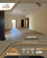 For rent: An apartment in Isa Town, close to the Modern Institute, suitable for family living in a quiet neighborhood. First, apartment details: 3 bedrooms (2 of them are master bedrooms), 4 bathrooms, a living room, a laundry room, a storage room, and a kitchen with a balcony. Second, facilities and services: Close to essential services including supermarkets, schools, commercial complexes, and a shaded park. There is an elevator. Rent is 220 dinars, excluding electricity and water. For contact.
