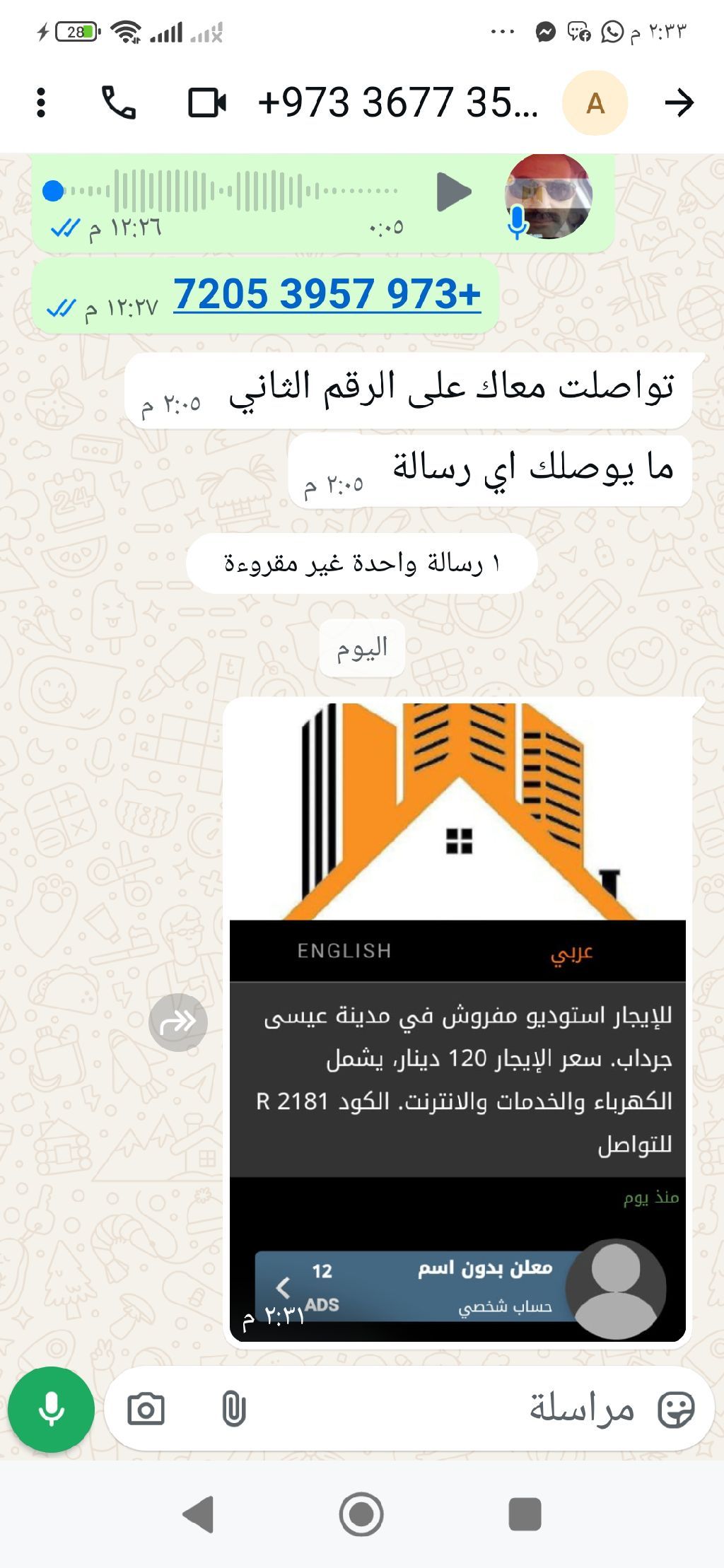 For rent: An apartment in Riffa East, including electricity and services. It consists of 1 bedroom, 2 bathrooms, 1 kitchen, and 1 living room. The rental price is 130 dinars, including electricity and services. Code: 8834 R for contact.