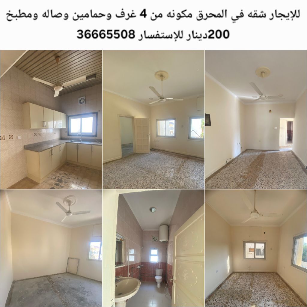 For rent, an apartment in Muharraq consisting of 4 rooms, 2 bathrooms, a living room, and a kitchen for 200 dinars.