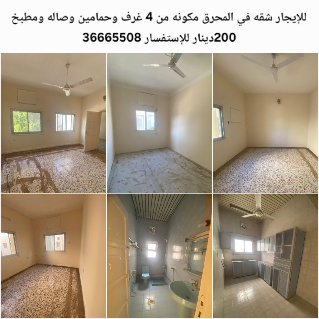 For rent, an apartment in Muharraq consisting of 4 rooms, 2 bathrooms, a living room, and a kitchen for 200 dinars.