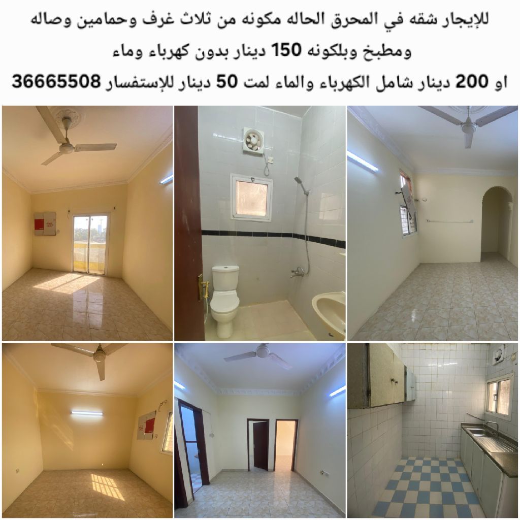 For rent: An apartment in Muharraq, consisting of three rooms, two bathrooms, a living room, a kitchen, and a balcony. 150 dinars without electricity and water, or 200 dinars including electricity and water up to 50 dinars.