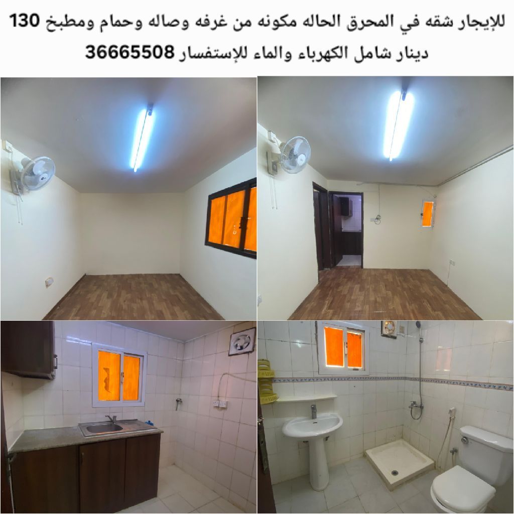For rent, an apartment in Muharraq consisting of one bedroom, a living room, a bathroom, and a kitchen for 130 dinars, including electricity and water.