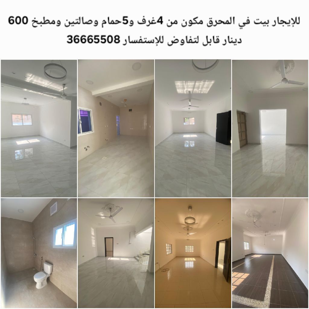 For rent: a house in Muharraq consisting of 4 rooms, 5 bathrooms, two halls, and a kitchen for 600 dinars, negotiable.