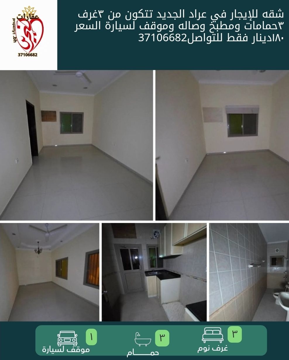 An apartment for rent in New Arad consisting of 3 rooms, 3 bathrooms, a kitchen, a living room, and a parking space. The price is only 180 dinars. For contact.