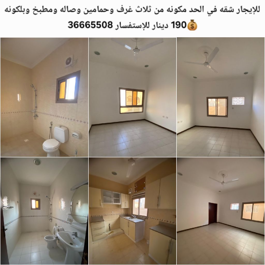 For rent, an apartment in Al Hidd consisting of three rooms, two bathrooms, a living room, a kitchen, and a balcony for 190 dinars.