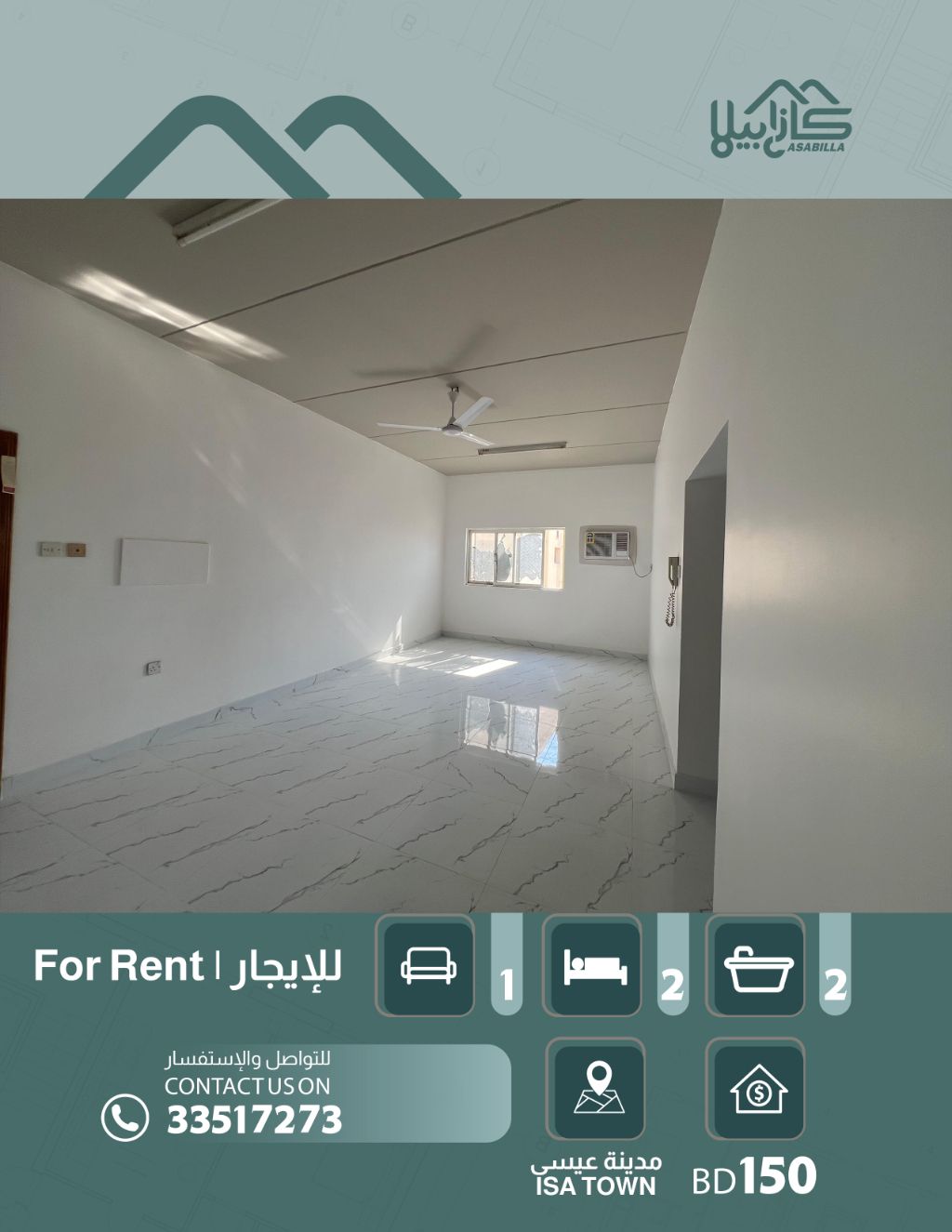 For rent: An apartment in Isa Town, behind Abayat Street, with air conditioners, a refrigerator, an oven, and a bedroom. First, apartment details: 1 bedroom, 1 bathroom, 1 family living room, 1 kitchen, and a large balcony. Second, facilities and services: shaded parking, close to services and Jidali Street. Rent is 150 BHD, excluding electricity and water. For more information, please call.