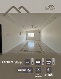 Apartment for rent in Sanad, close to the post office. Services include commercial complexes, restaurants, shops, schools, a mosque, and more. It has 2 bedrooms, 1 master bedroom, 2 bathrooms, a living room, a large kitchen, and a balcony. Services and facilities include a shaded parking space. The area is very quiet. Rent is 165 without electricity and water. For contact.