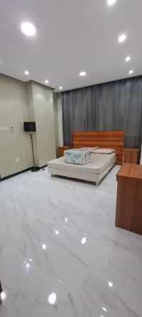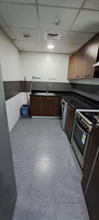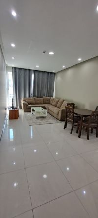 For rent An apartment in Al - Busaiteen consisting of one bedroom, two bathrooms, a kitchen, a living room, and a balcony. The rent is 280 dinars, with an electricity charge of 20 dinars. The apartment is number 124 in Dar Al - Izz Tower 3, close to King Hamad Hospital and the University of Bahrain
