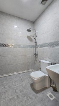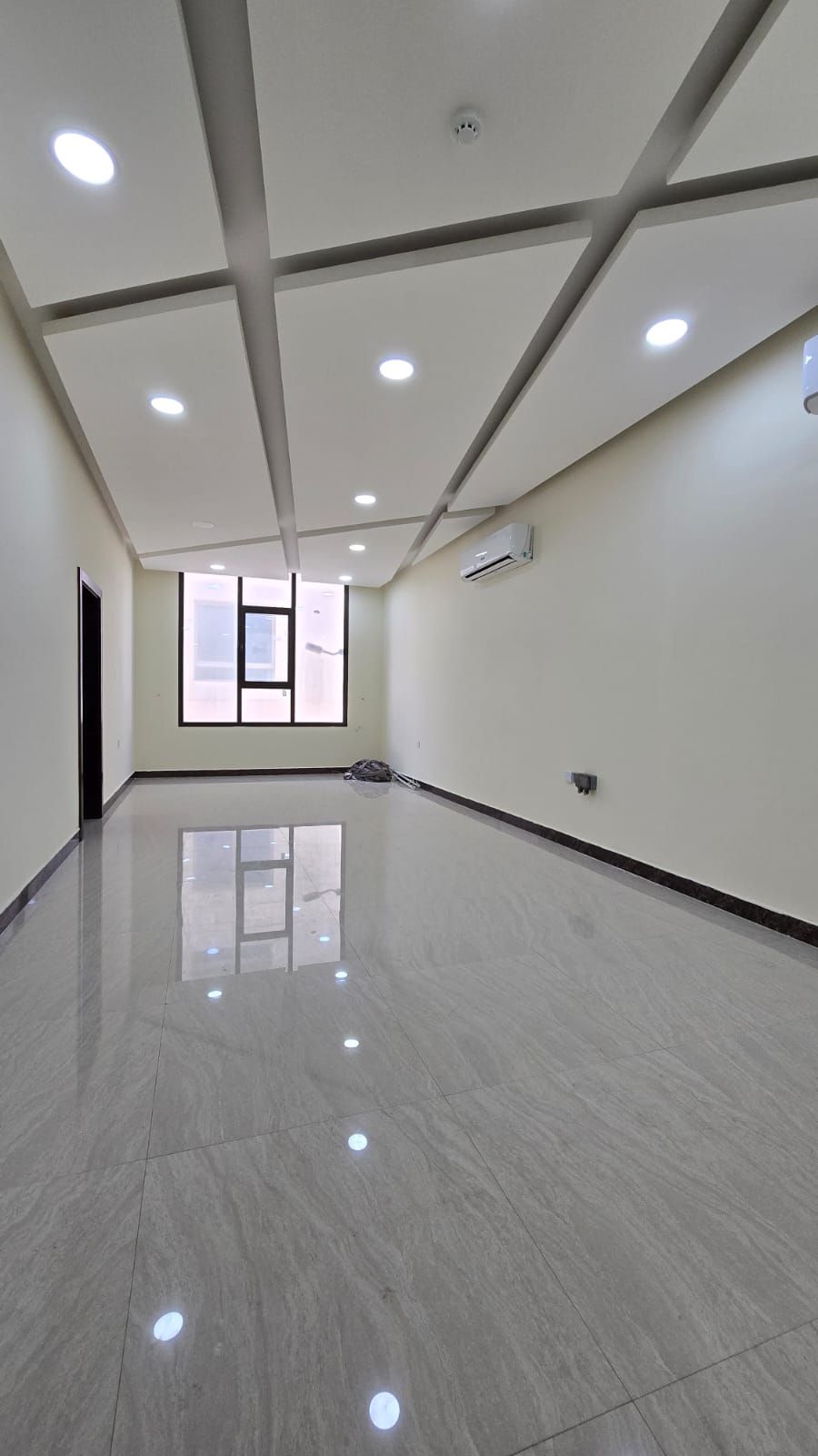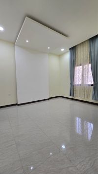 For rent, an apartment in Al-Hadd consisting of 2 bedrooms, 3 bathrooms, a living room, a kitchen, a parking space, an elevator, and air conditioning for 220 dinars.