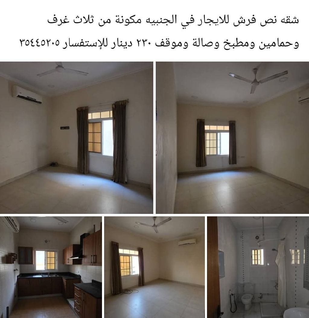 A semi-furnished apartment for rent in Janabiya, consisting of three rooms, two bathrooms, a kitchen, a living room, and a parking space for 230 dinars.