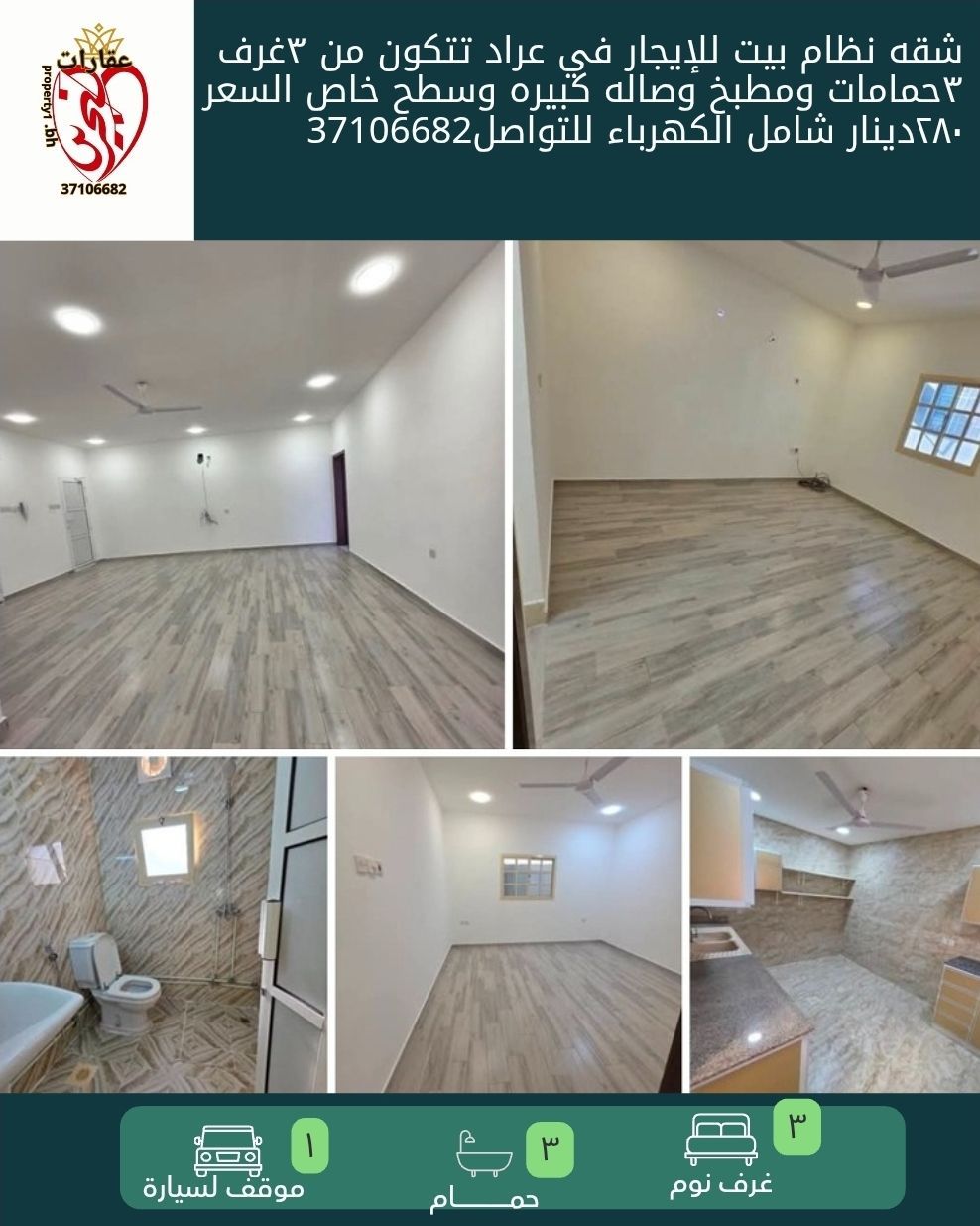 An apartment for rent in Arad, consisting of 3 bedrooms, 3 bathrooms, a kitchen, a large living room, and a private roof. The price is 280 dinars, including electricity. For contact.