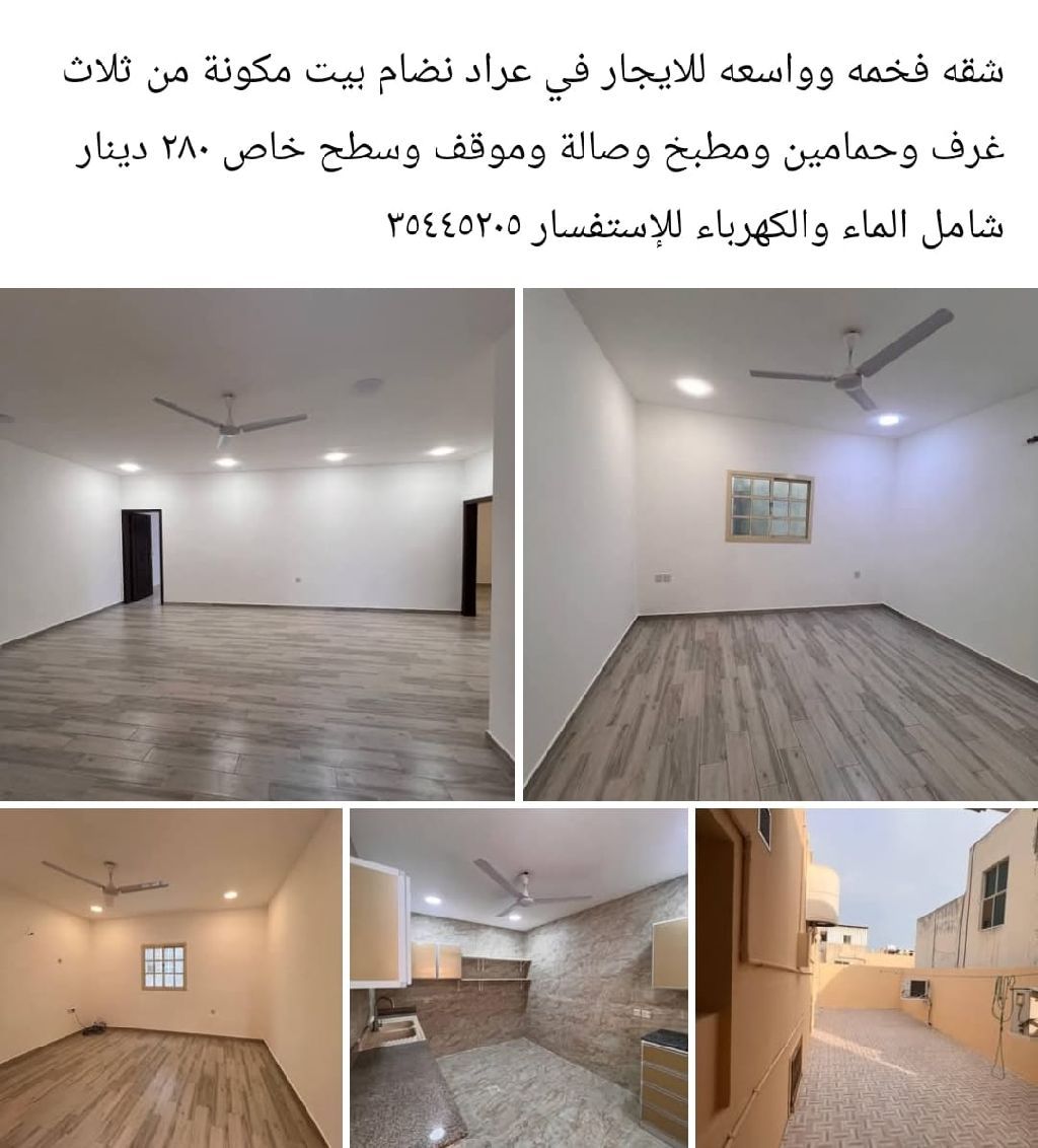 A luxurious and spacious apartment for rent in Arad, a house system consisting of three rooms, two bathrooms, a kitchen, a hall, a parking space, and a private roof. 280 dinars including water and electricity.