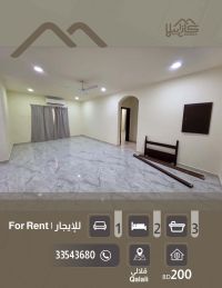 For rent: An apartment in the Qalali area. First, apartment details: 2 master bedrooms, a maid's room, a laundry room, a spacious living room with a bathroom, and 3 bathrooms. Second, facilities and services: elevator, parking space, close to markets and commercial shops. Rental price: 200 dinars without electricity. For contact.