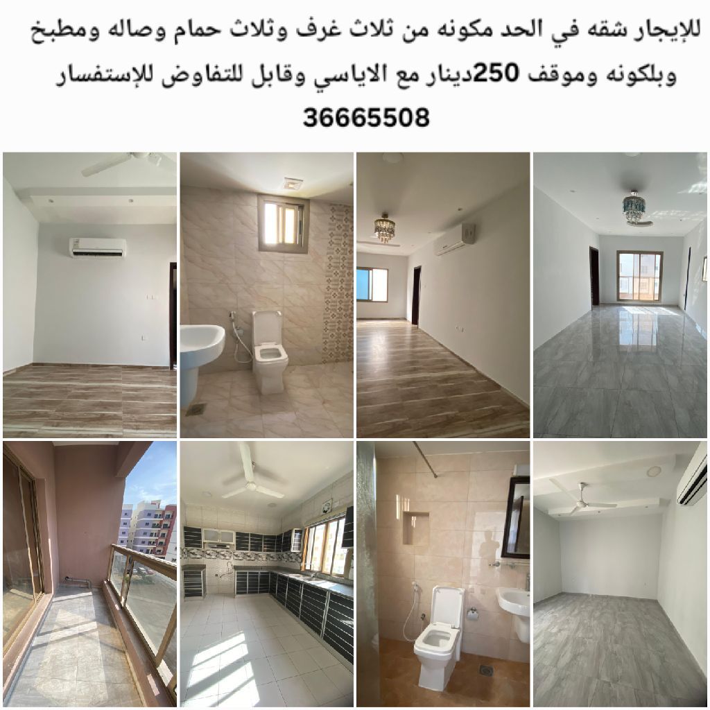 For rent, an apartment in Al-Hadd consisting of three rooms, three bathrooms, a hall, a kitchen, a balcony, and a parking space for 250 dinars, negotiable.