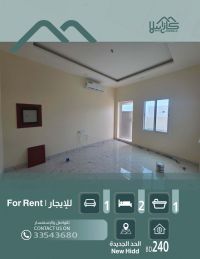 For rent: An apartment including electricity in Al-Hadd, suitable for employees, a family, or a commercial office. Details: 2 rooms, a hall, a bathroom. Facilities and services: The apartment includes air conditioners and an elevator. Suitable for a family, employees, or an office. Rental price: 240 including electricity. For contact.
