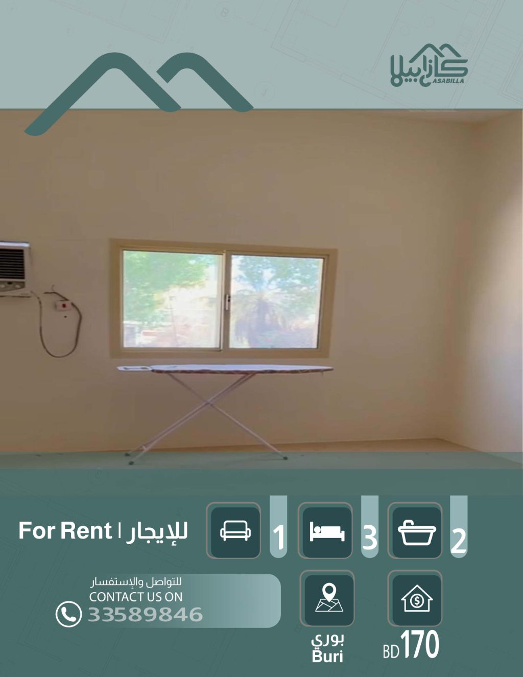 Apartment for rent in Bouri. A great opportunity for living in a quiet area close to services. Location: Bouri Village. Specifications: 3 bedrooms, 2 bathrooms, large living room, parking space. Price: 170 dinars, excluding electricity and water. For inquiries and contact.