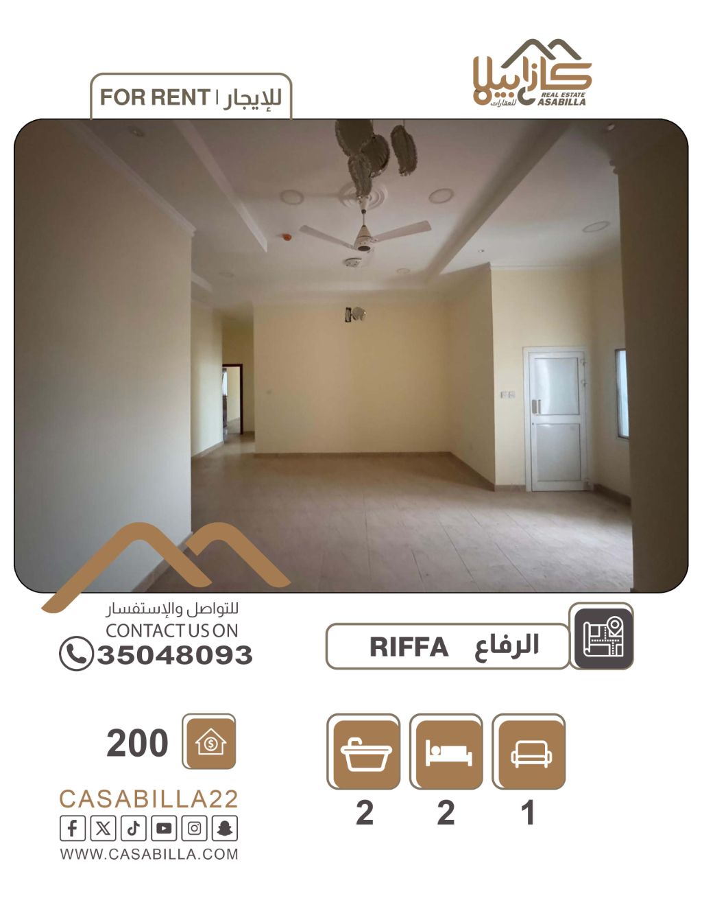 Apartment for rent in Riffa Al Bahri. A unique opportunity for housing in a quiet location suitable for families, and close to all essential services. Apartment specifications: two bedrooms (one master), two bathrooms, a spacious living room, a practical kitchen, a balcony. Services and facilities: shaded car parking, a quiet and safe area, a location close to all services. Rental price: 200 dinars. For contact and inquiries.