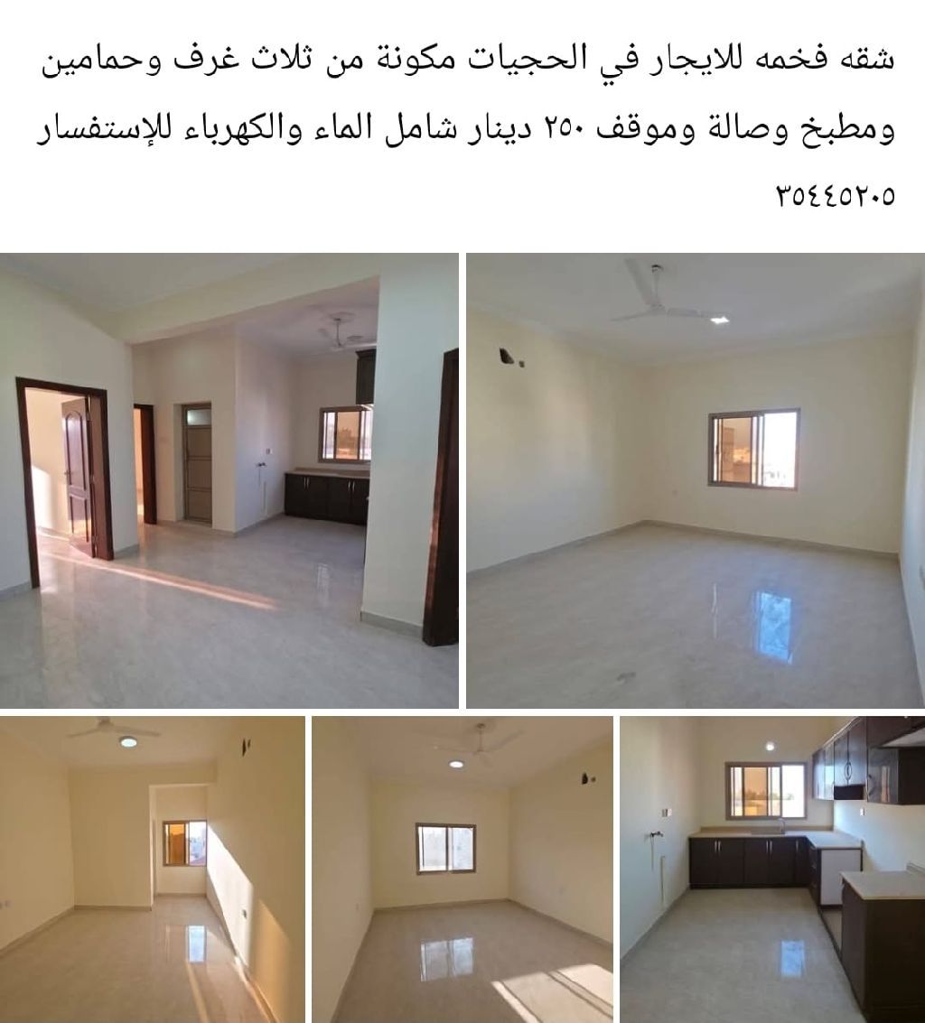 A luxurious apartment for rent in Al-Hajiyat, consisting of three rooms, two bathrooms, a kitchen, a living room, and a parking space for 250 dinars, including water and electricity.