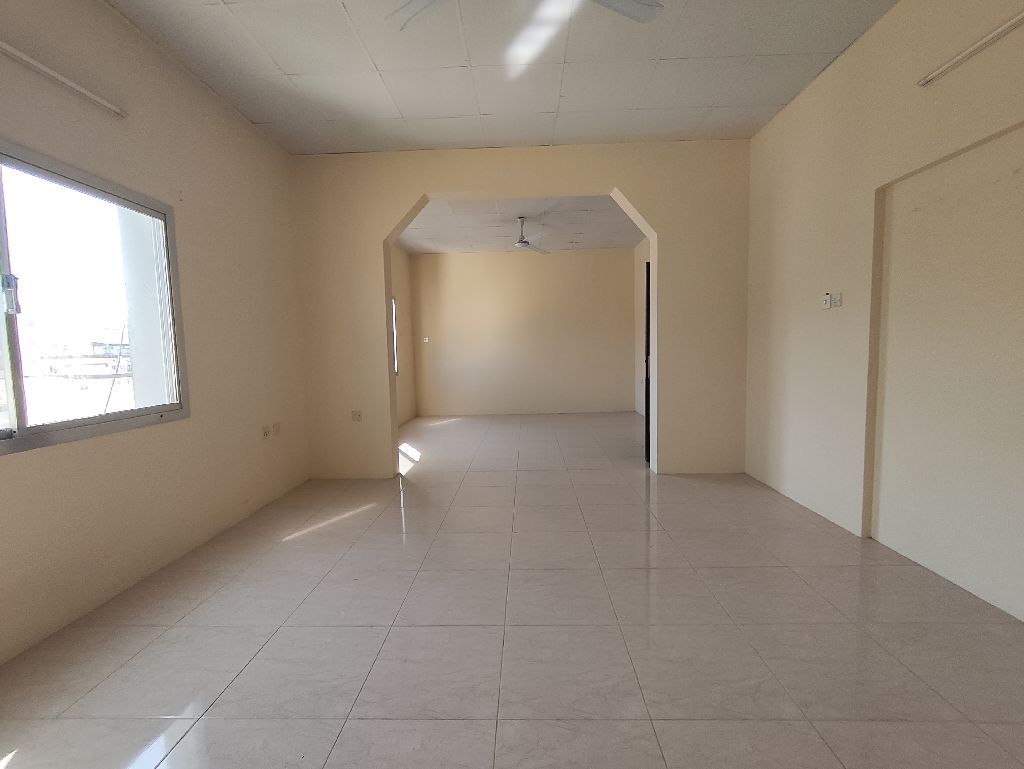 Umm Al Hassam: Spacious 2 BHK unfurnished flat for rent. BD 240 without EWA. 3-phase EWA. Two big halls, 2 bedrooms, 2 bathrooms, and a closed kitchen. Available elevator and car parking. Ref No: K041103. Contact for details.