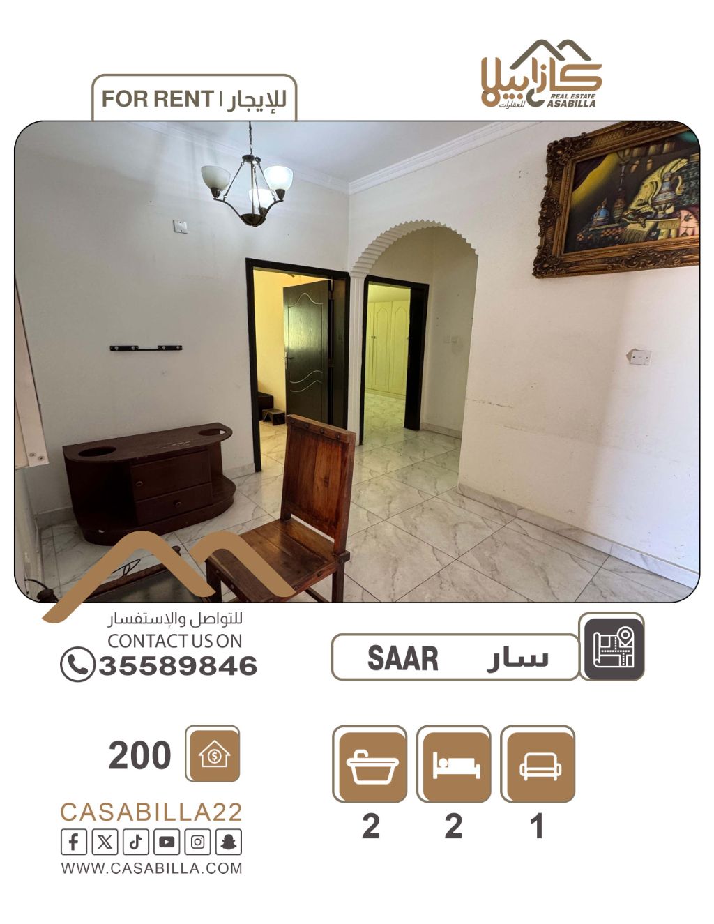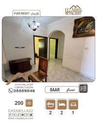 For rent: An apartment in Sar. A distinctive apartment close to all services. It consists of two bedrooms, two bathrooms, a living room, and a kitchen. Rent is 200 dinars, including electricity, water, and municipality fees. Location: Sar. For contact and inquiries, write your number here.