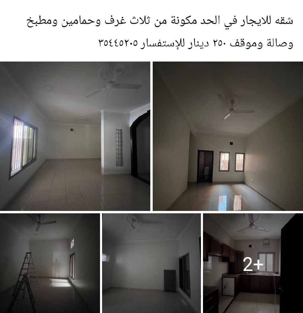 An apartment for rent in Al-Hadd, consisting of three rooms, two bathrooms, a kitchen, a hall, and a parking space for 250 dinars. An opportunity not to be missed.