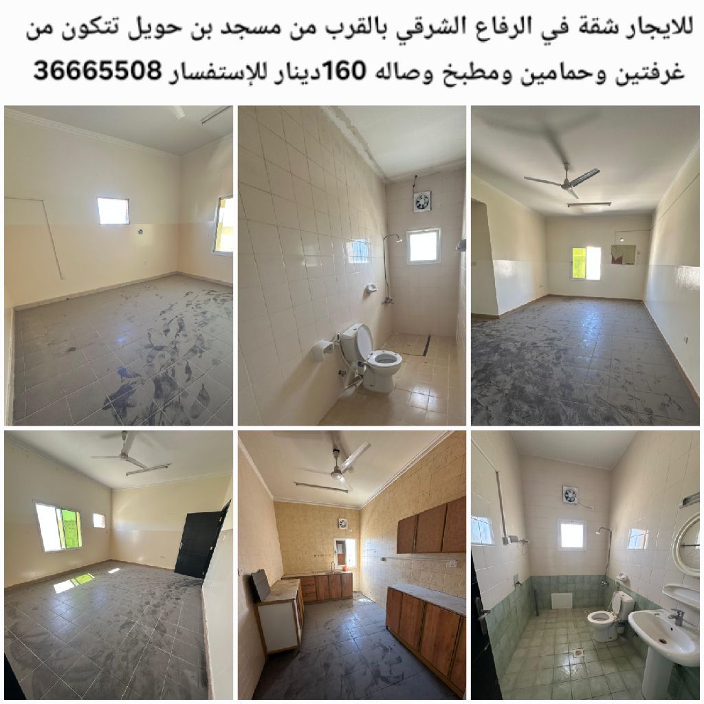 For rent, an apartment in East Riffa near Ibn Huwayl Mosque, consisting of two rooms, two bathrooms, a kitchen, and a hall for 160 dinars.