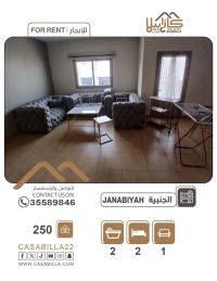 An apartment for rent in the Al-Junubiyah area, consisting of two bedrooms, a spacious living room, a fully equipped kitchen, two bathrooms, and a balcony. The apartment is semi-furnished (including air conditioners, curtains, seating, oven, refrigerator, washing machine, and more). The price is 250 dinars inclusive of electricity and water, or 200 dinars exclusive plus 50 dinars for electricity. Additional features include an elevator, parking, a quiet and upscale area, and a prime location in Al-Junubiyah. For contact and inquiries.