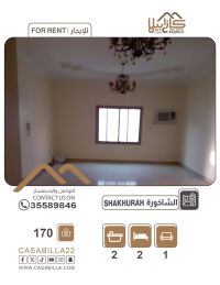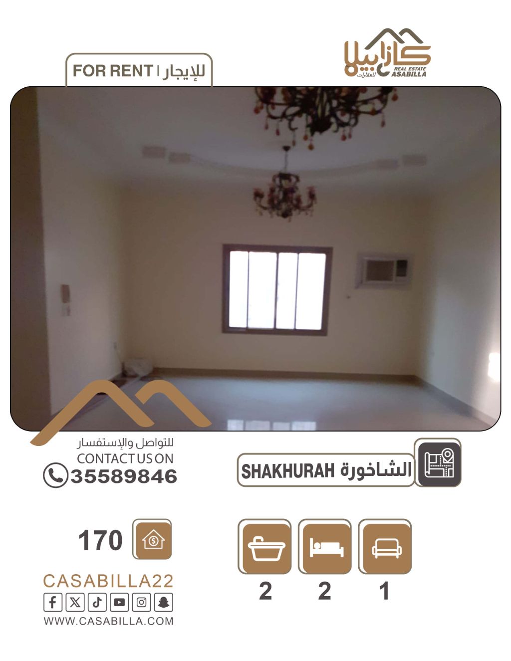 An apartment for rent in Al-Shakhura consisting of two bedrooms, a living room, a kitchen, and two bathrooms, with air conditioners. The rental price is 170 dinars (excluding electricity). It is located in a quiet and suitable area for living. For contact and inquiries.