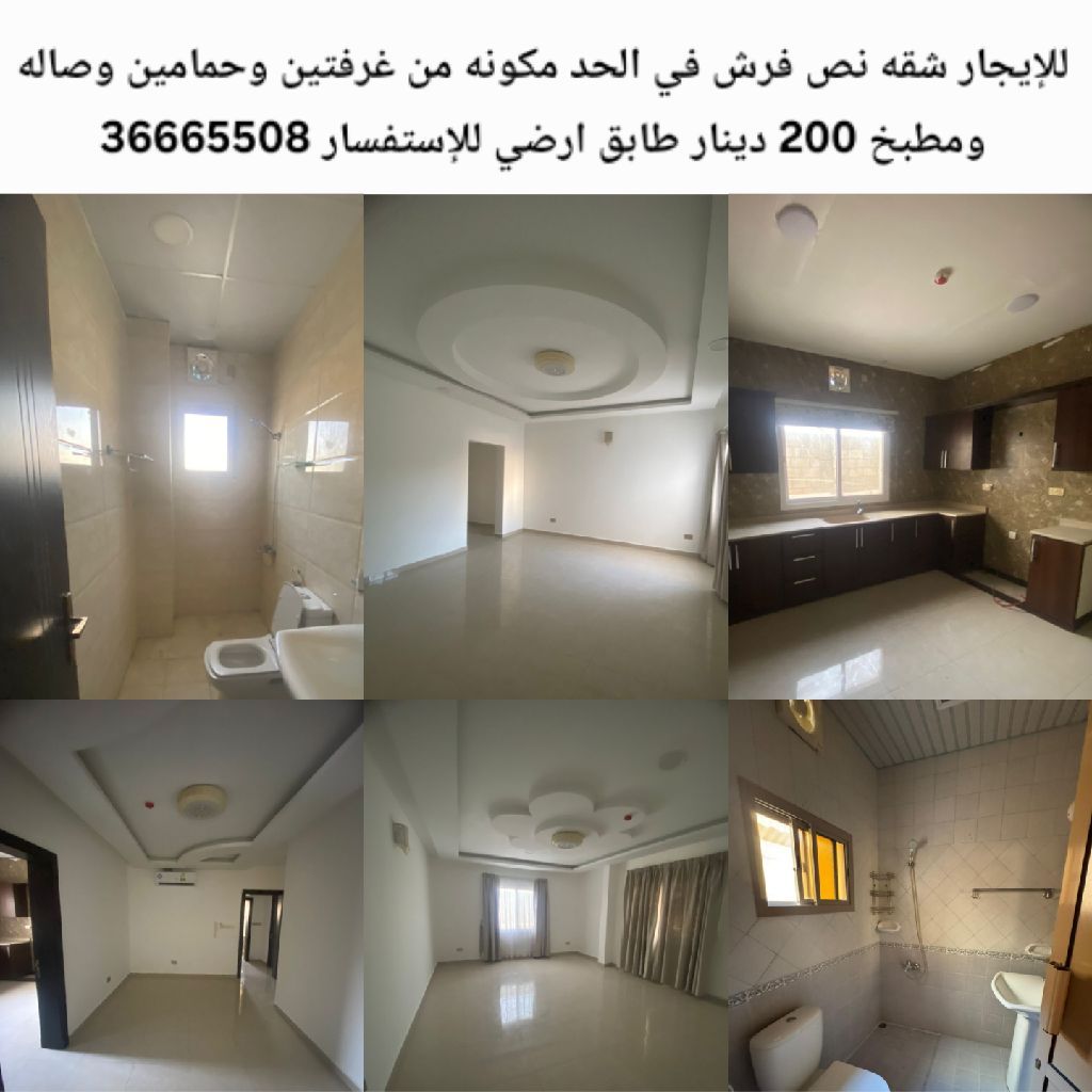 For rent, a semi-furnished apartment in Al-Hadd, consisting of two bedrooms, two bathrooms, a living room, and a kitchen, for 200 dinars, ground floor.