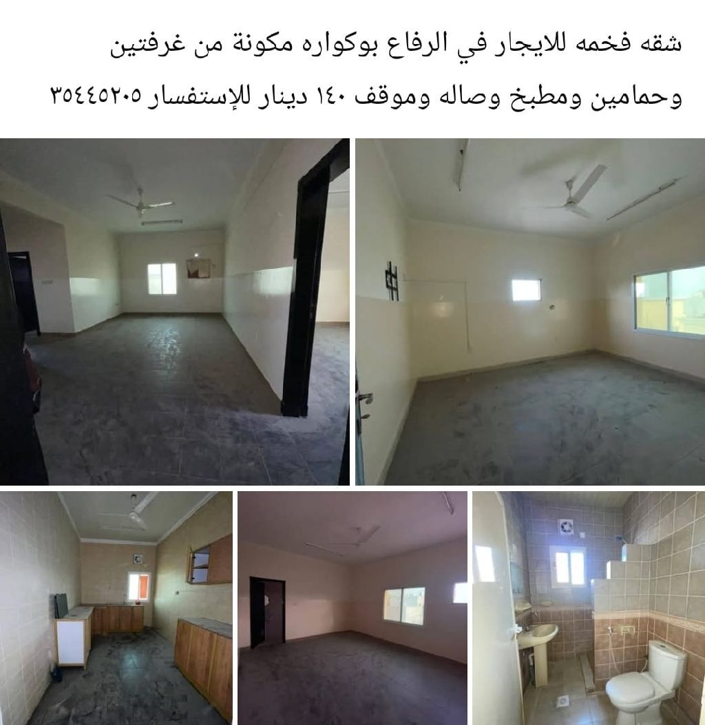 A luxurious apartment for rent in Riffa Abu Quwara, consisting of two bedrooms, two bathrooms, a kitchen, a living room, and a parking space for 140 dinars.