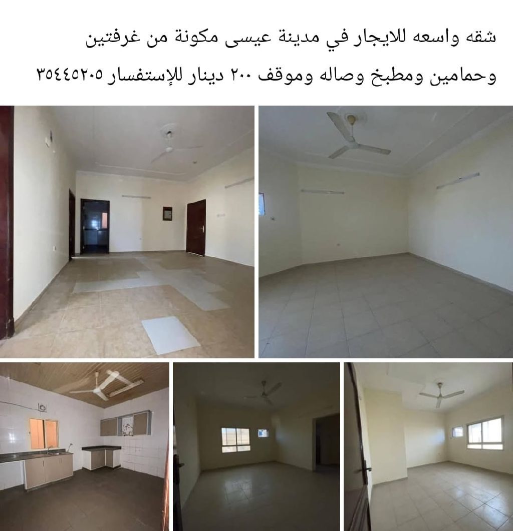 A spacious apartment for rent in Isa Town, consisting of two bedrooms, two bathrooms, a kitchen, a living room, and a parking space for 200 dinars.
