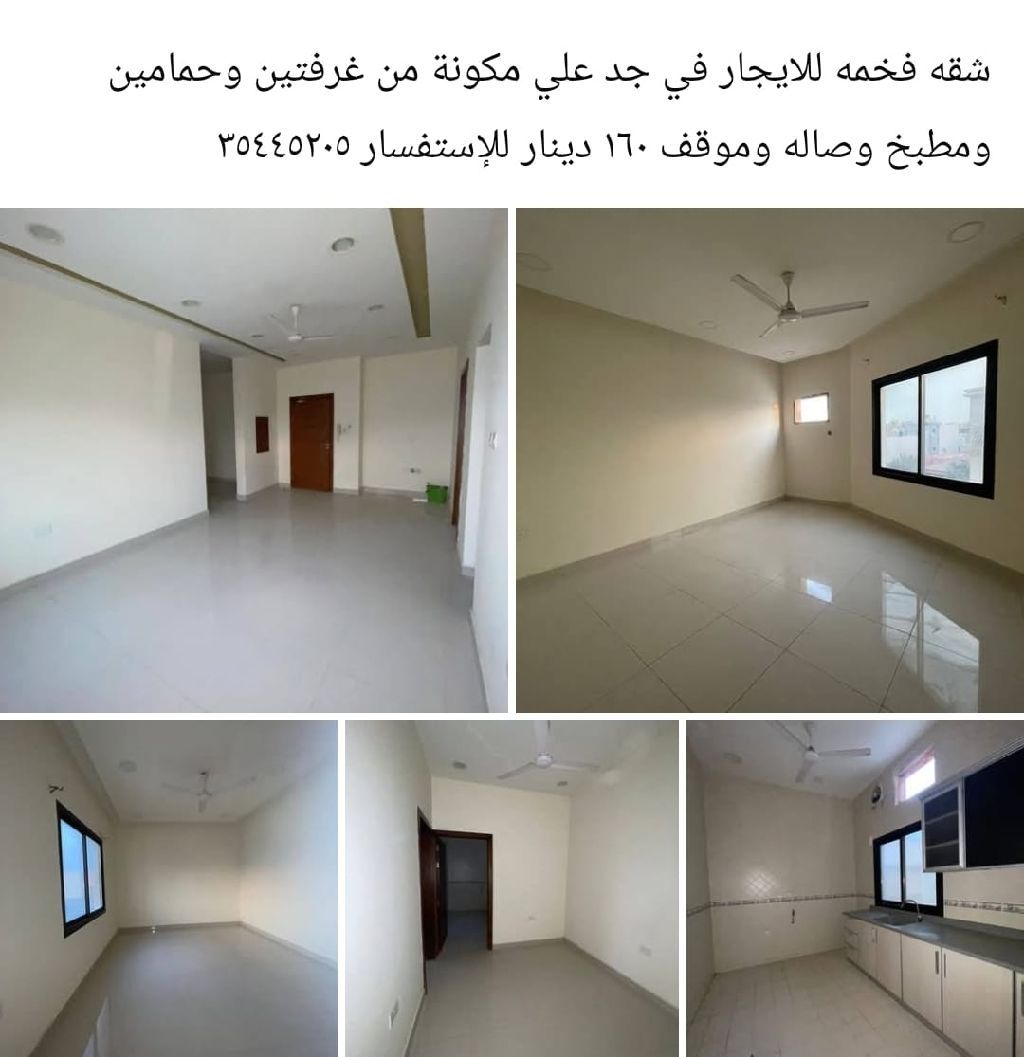 A luxurious apartment for rent in Jid Ali, consisting of two bedrooms, two bathrooms, a kitchen, a living room, and a parking space, for 160 dinars.