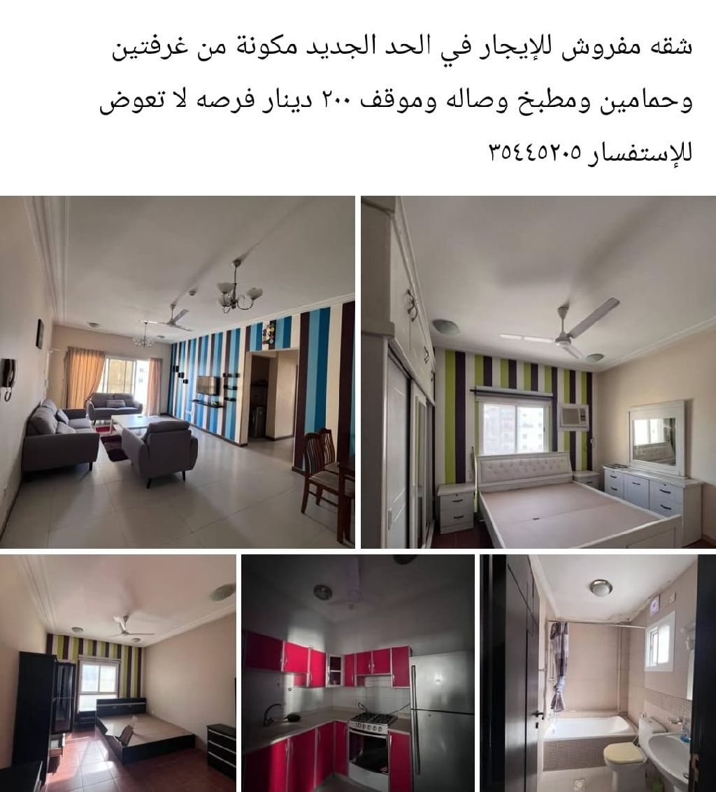 A furnished apartment for rent in Al-Hadd Al-Jadeed, consisting of two bedrooms, two bathrooms, a kitchen, a living room, and a parking space for 200 dinars. An opportunity not to be missed.