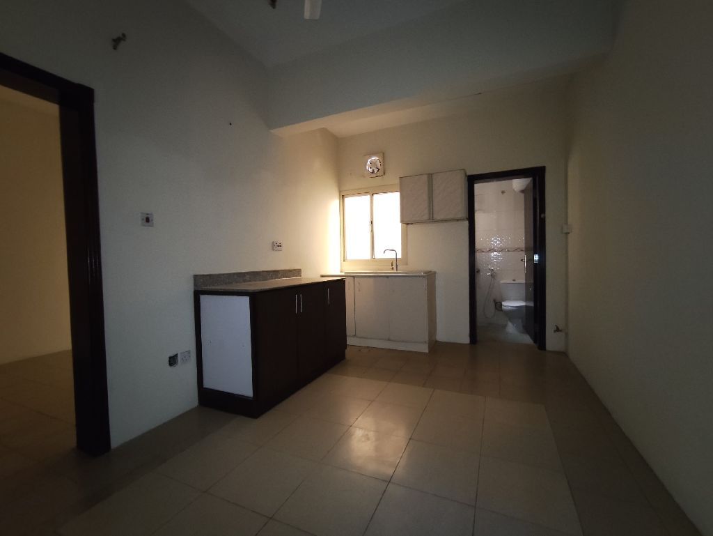 Ras Rumman, on the main road, close to Al Shifa Hospital. Studio unfurnished flat for rent. BD120 without Ewa. Separate water meter. Entrance with open kitchen, 1 room, and 1 bathroom. Elevator available. Reference number K061102. Contact for details.