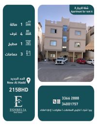 We have a building consisting of (6) apartments for rent in the Al-Had Al-Jadeed area, close to services. Group A consists of two large apartments (apartment components): 4 - spacious bedrooms including a master bedroom, 3 - bathrooms, 1 - kitchen, 1 - living room. The requested price is (215) dinars. License number B201804 / 0125. For contact: Al-Ishbiliya Office, Bouabdallah. Ad number (90).