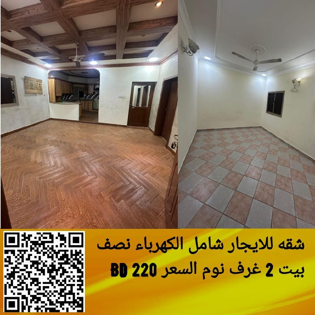 An apartment for rent, including electricity and water, attached to a house in Isa Town. It consists of 2 bedrooms, 1 bathroom, 1 living room, 1 kitchen, and a private entrance. The price is 220 dinars, including electricity and water. For contact.