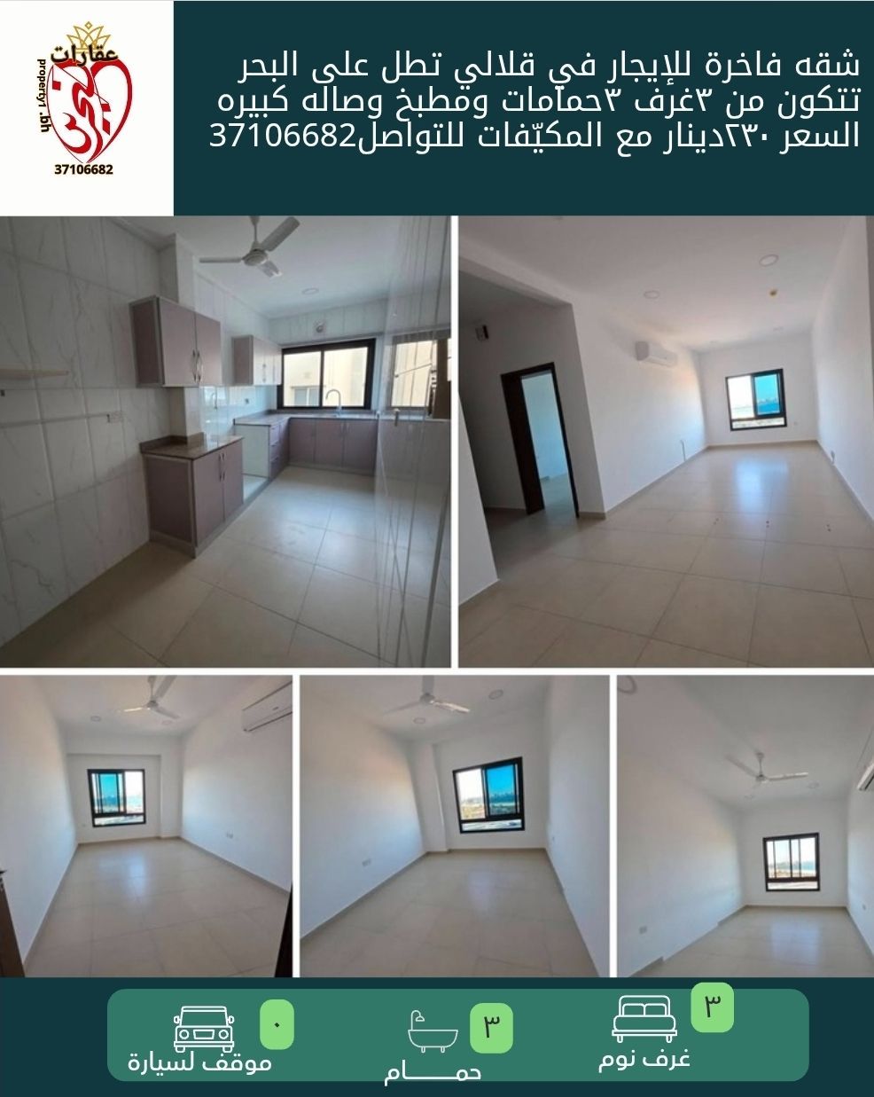 A luxurious apartment for rent in Qalali with a sea view, consisting of 3 bedrooms, 3 bathrooms, a kitchen, and a large living room. The price is 230 dinars with air conditioning included. For contact.