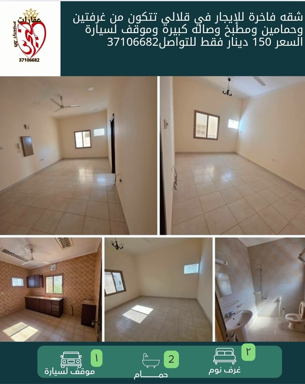 A luxurious apartment for rent in Qalali, consisting of two bedrooms, two bathrooms, a kitchen, a large living room, and a parking space. Price is only 150 dinars. For contact.