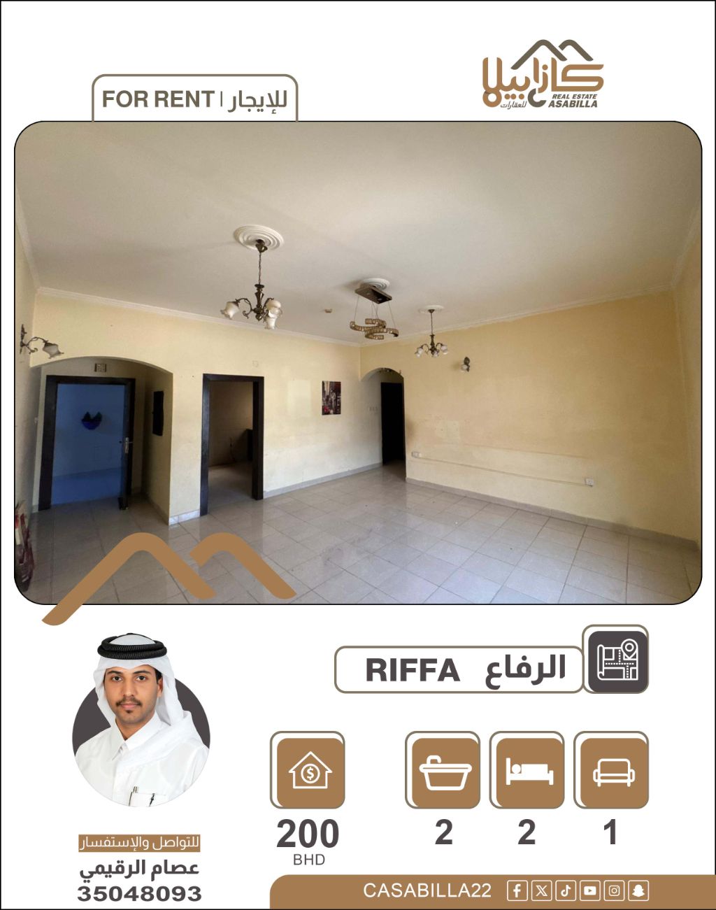 For rent: A distinctive apartment in West Riffa. A beautiful apartment located in a very quiet and family-friendly area, close to all essential services, within an organized and secure building. Apartment specifications: Two bedrooms (one master), two bathrooms, a spacious living room, a practical kitchen. Services and facilities: Elevator, building monitored by cameras, shaded parking, quiet residential area close to all services. Rental price: 200 Bahraini dinars. For contact and inquiries.