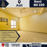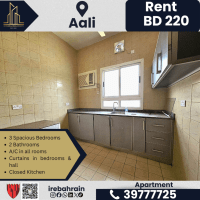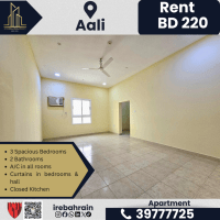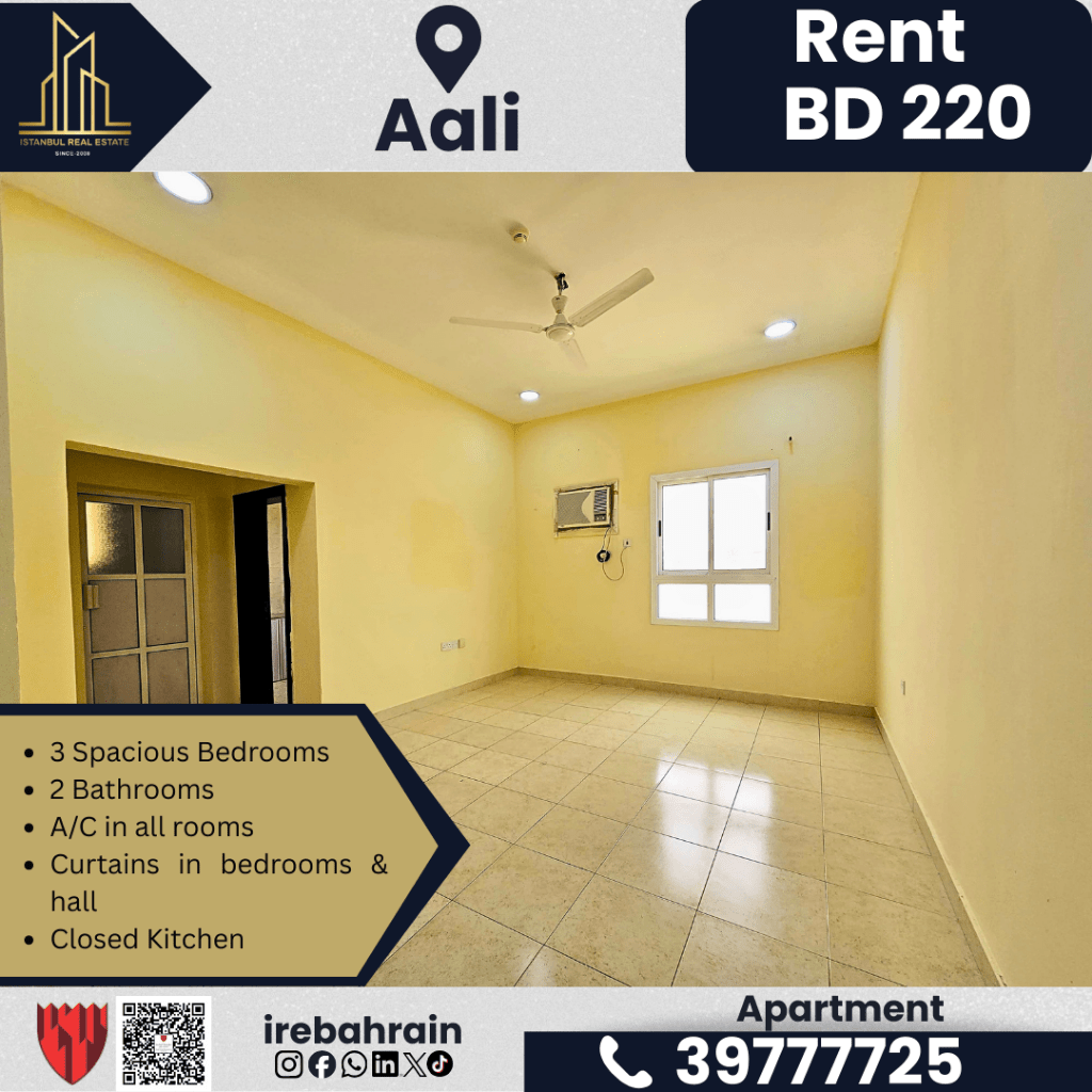 A family apartment with 3 bedrooms and a living room for rent in A'ali, Bahrain. A spacious apartment opposite Ramli Mall in a prime location. The family apartment has 3 bedrooms and a living room in excellent condition in a quiet residential area. Features of the apartment include 3 spacious bedrooms, two bathrooms, a living room, a closed kitchen, air conditioning in all rooms, curtains in the bedrooms and living room, and parking available. It is near Ramli Mall, Lulu, Bahrain International Hospital, and a driving school. Rent is 220 Bahraini Dinars per month (excluding electricity and water).