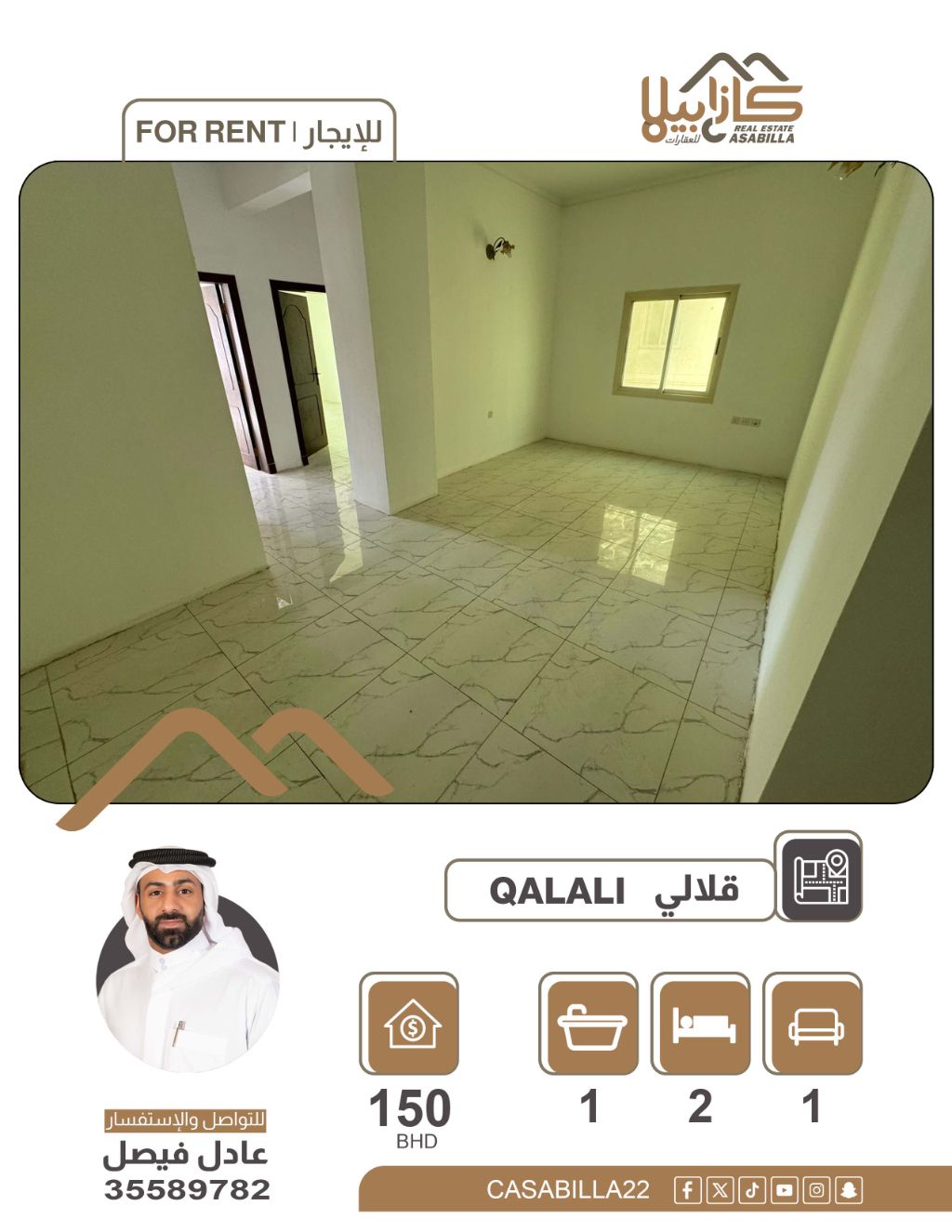 For rent: A two-bedroom apartment in Qalali, a modern building. The apartment is in a modern building with an excellent location in Qalali, close to services. Bedrooms: 2 - Bathrooms: 1 - Price: 150 dinars (electricity not included). Location: Qalali - Private parking and elevator. Strategic location near all services. Modern and clean building. For inquiries: For rent, Qalali, two bedrooms, modern building, Bahrain real estate.