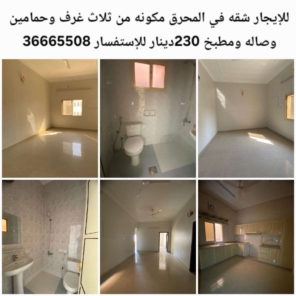For rent, an apartment in Muharraq consisting of three rooms, two bathrooms, a hall, and a kitchen for 230 dinars.